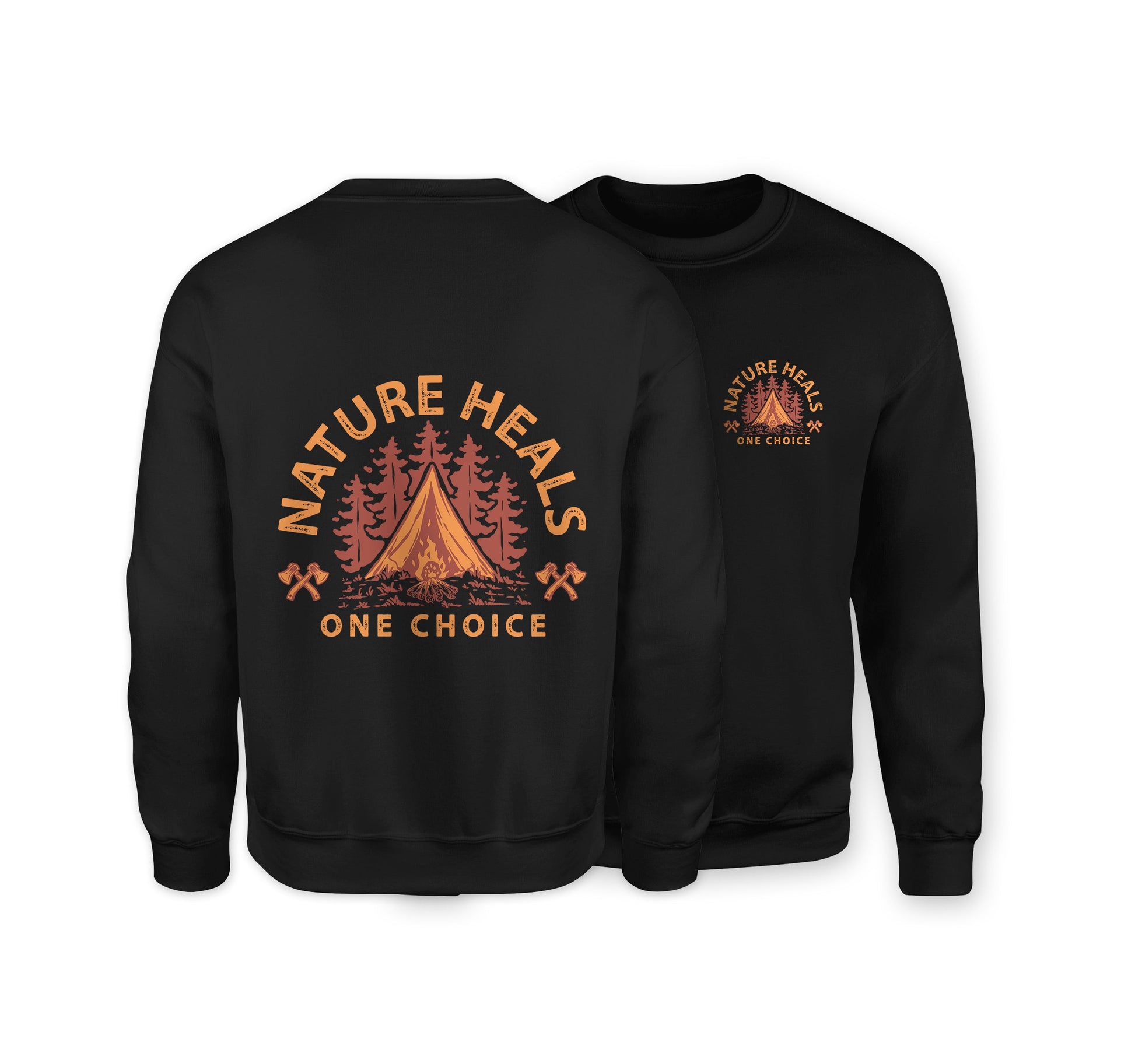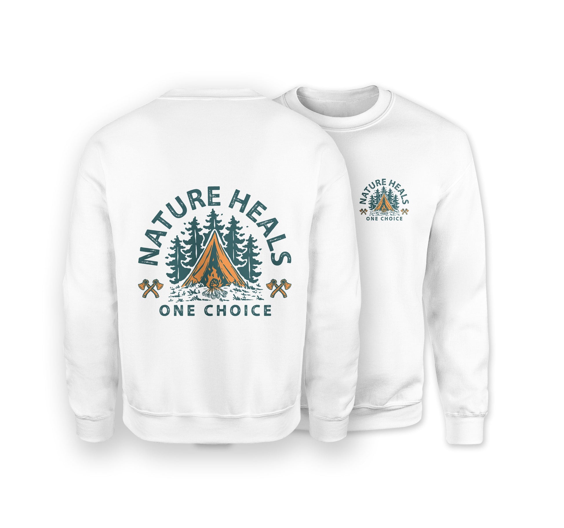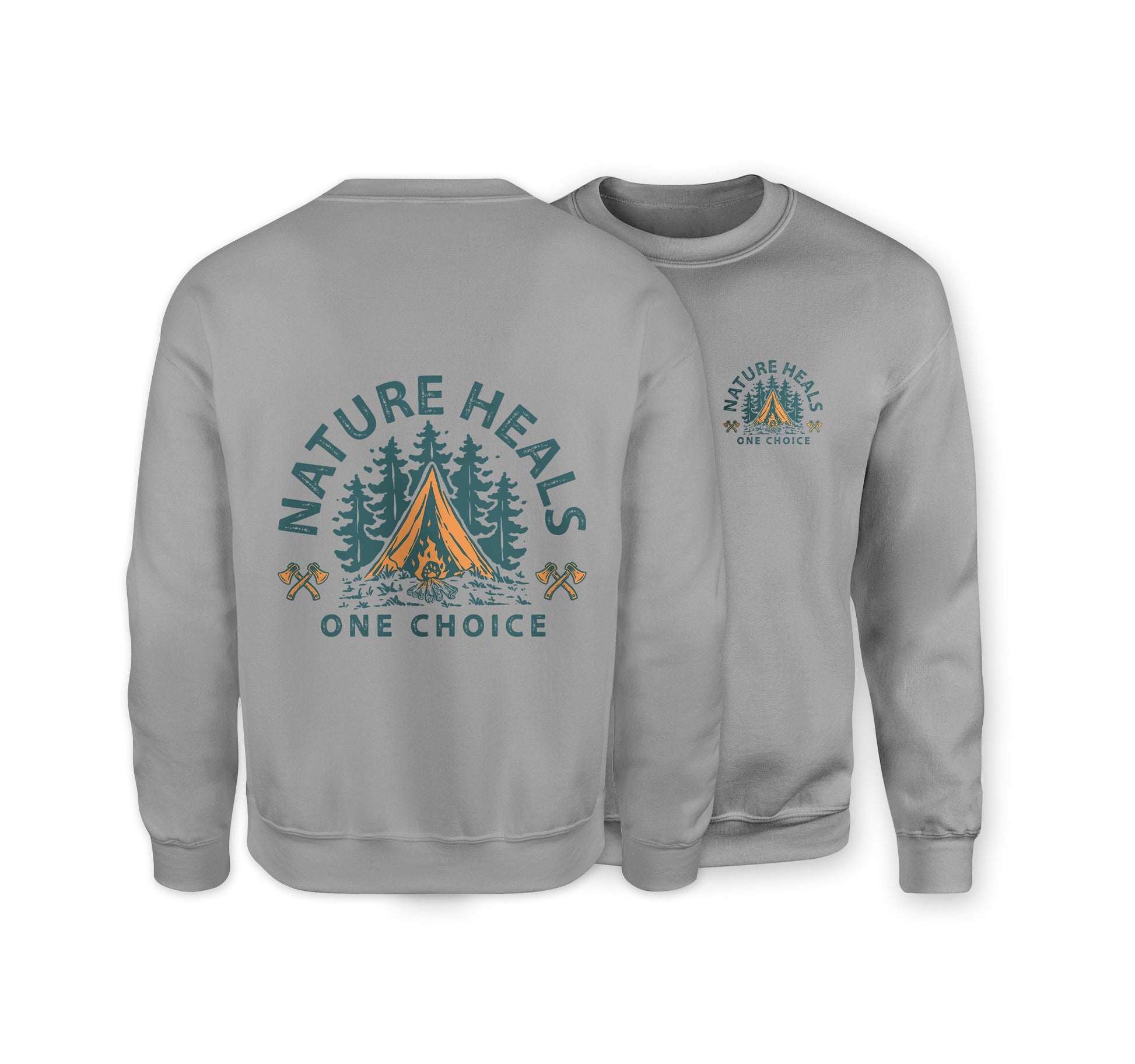 - Nature Heals Sweatshirt; Beautiful design printed on the back with pocket print on the front