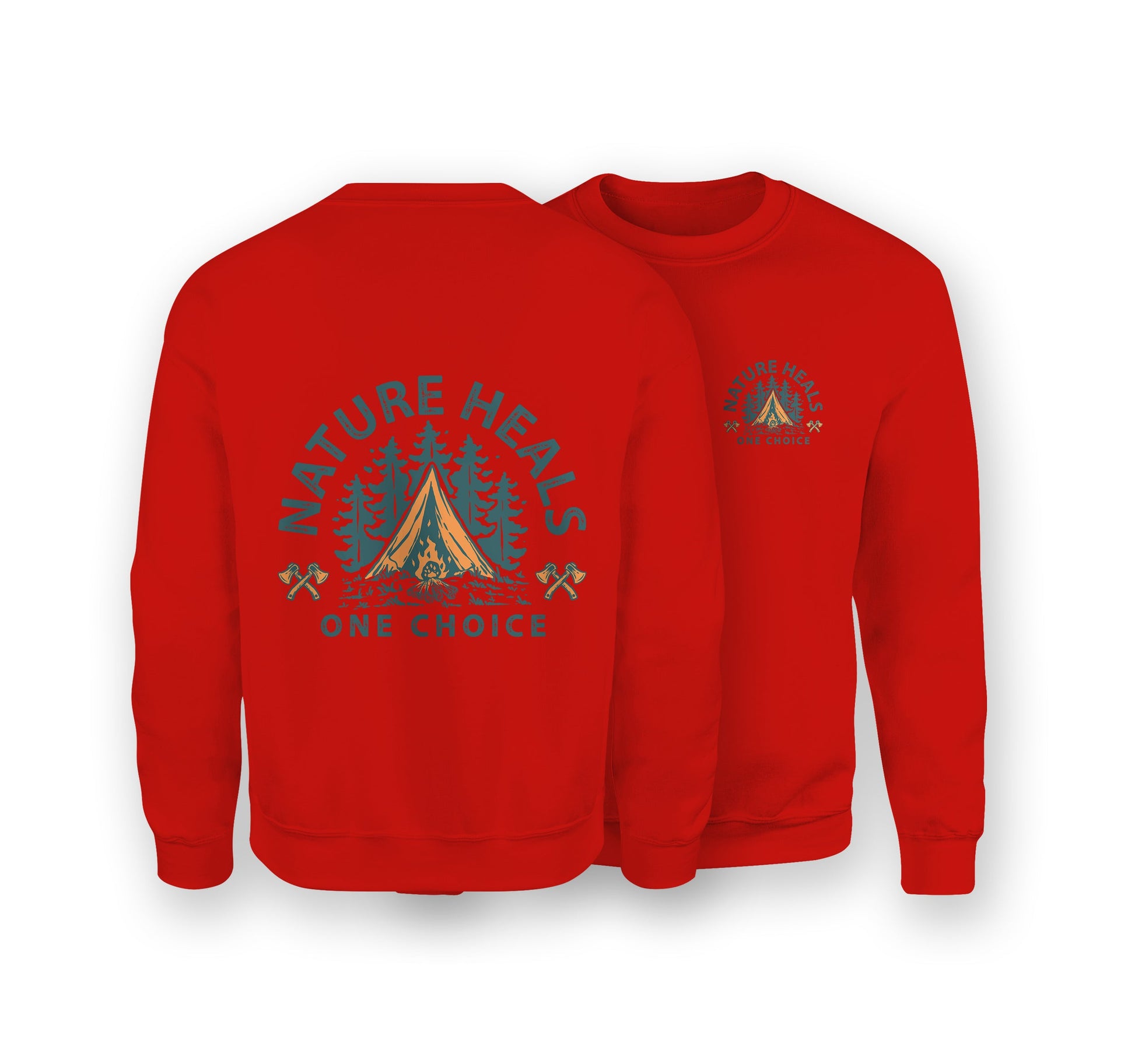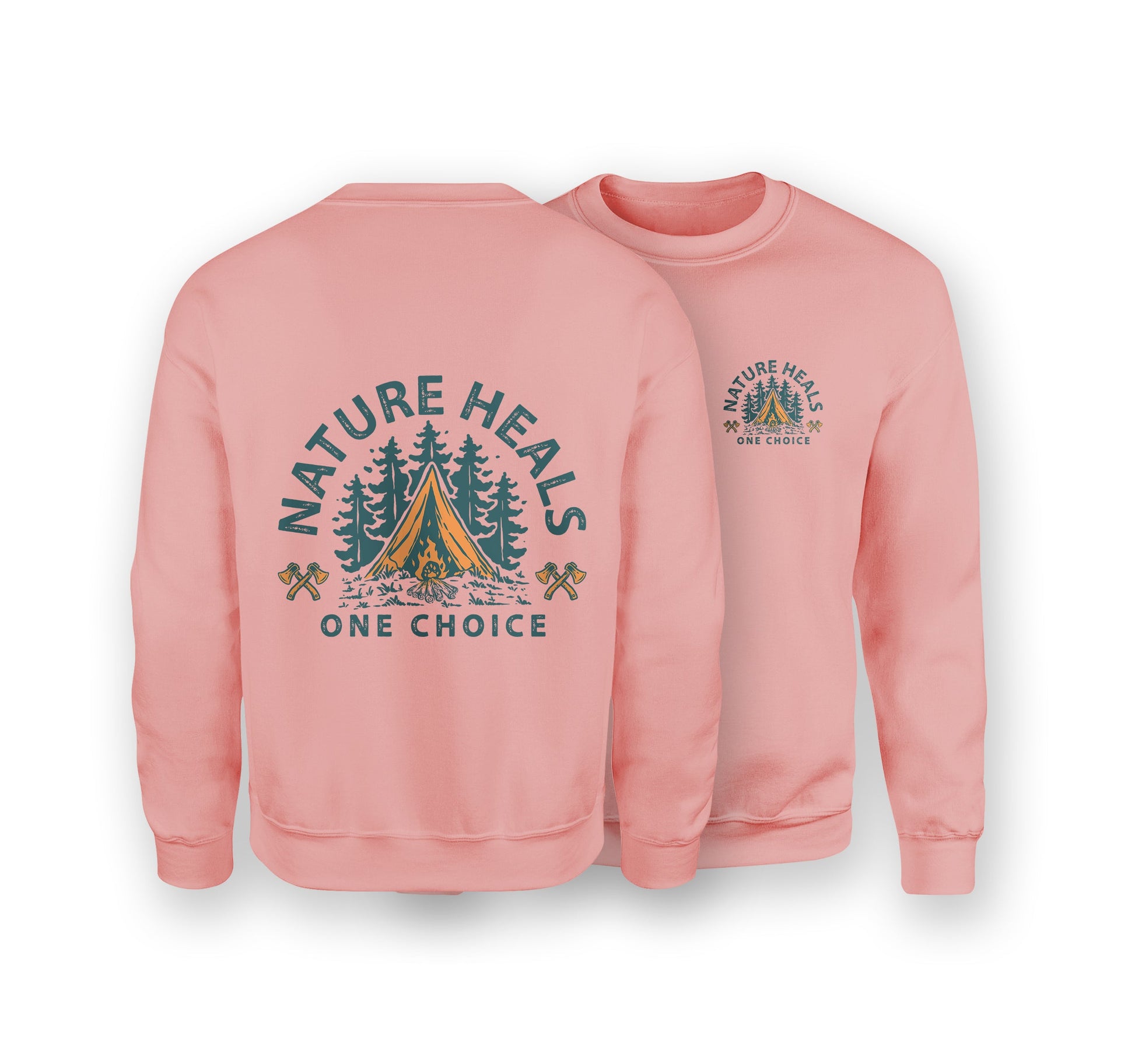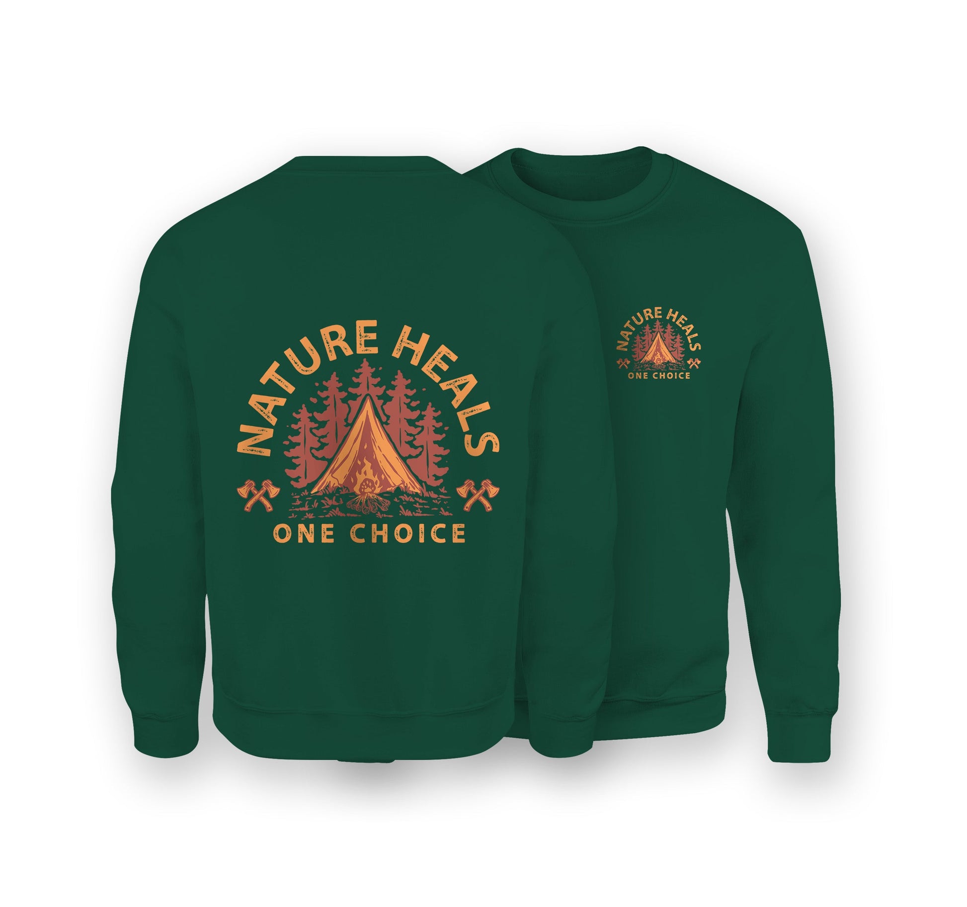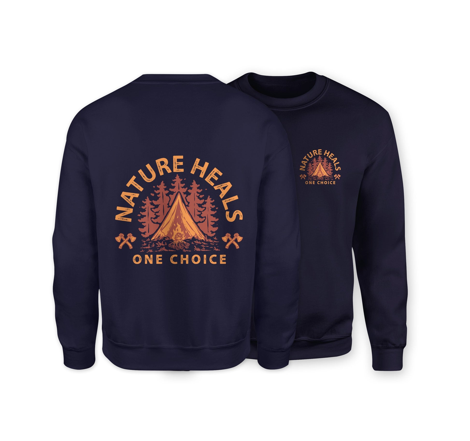 - Nature Heals Sweatshirt; Beautiful design printed on the back with pocket print on the front