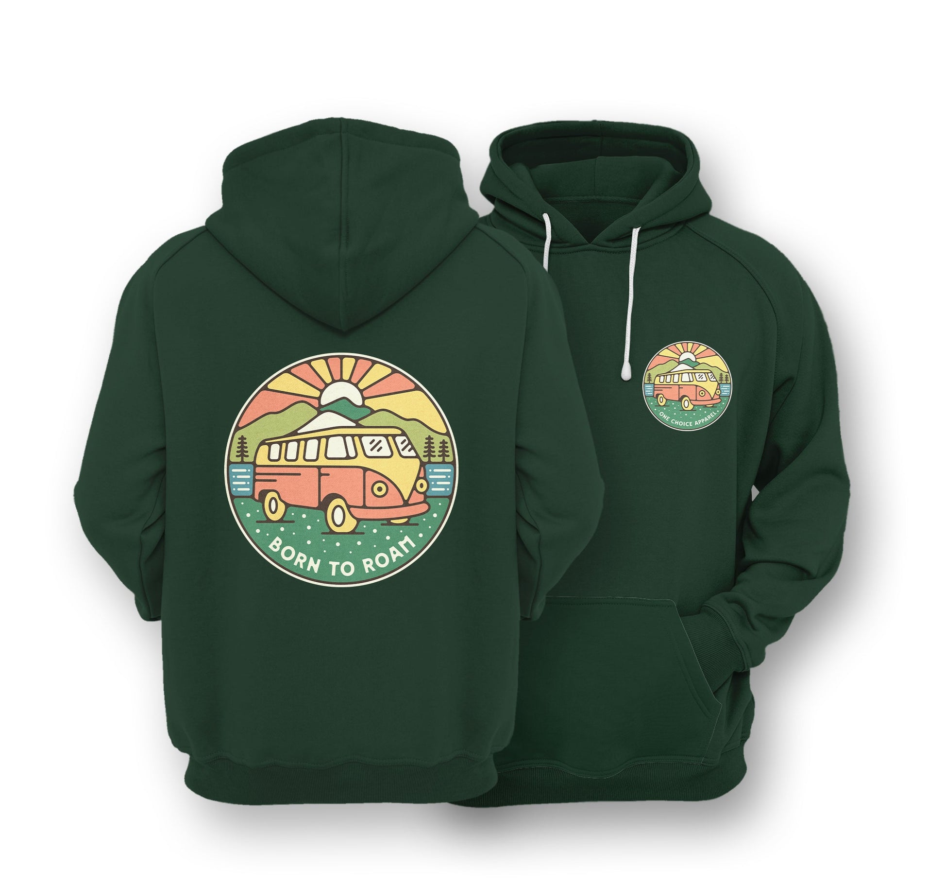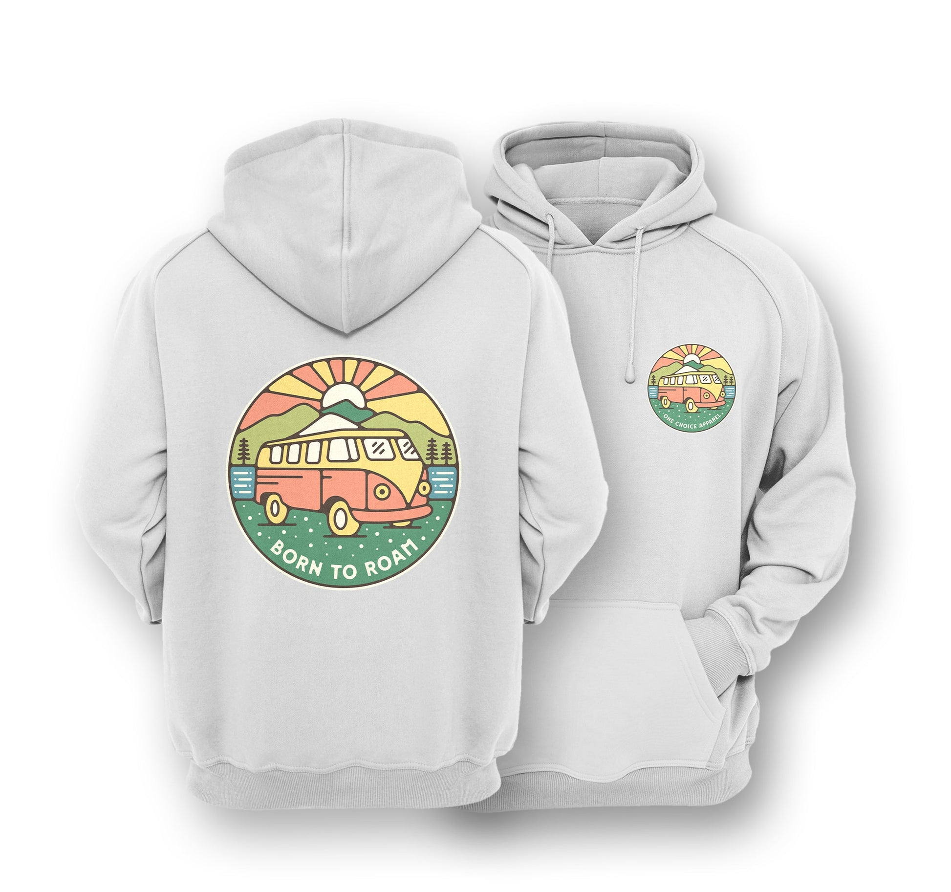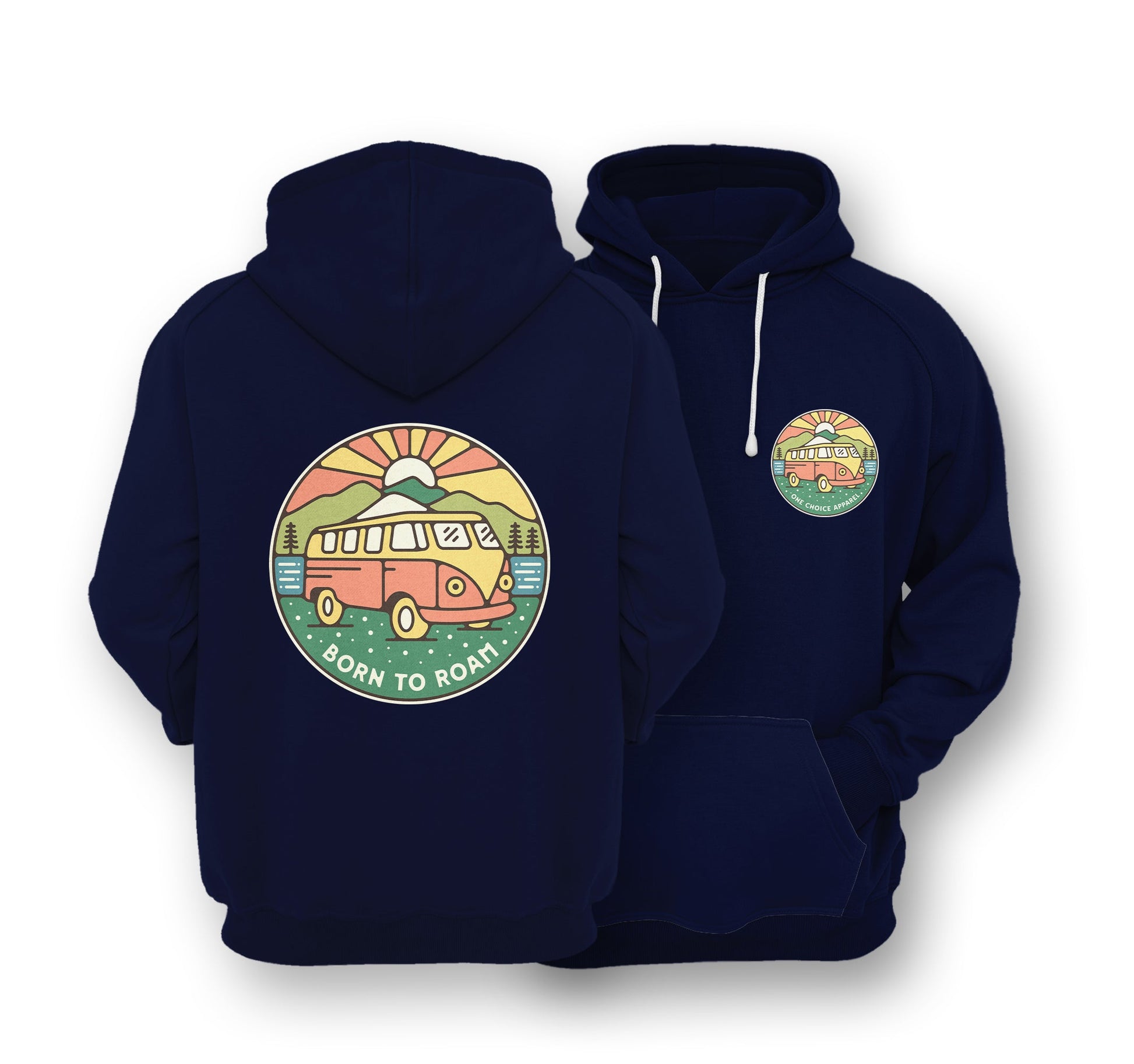 - Sustainable Hoodie - Born To Roam; Beautiful design printed on the back with pocket print on the front