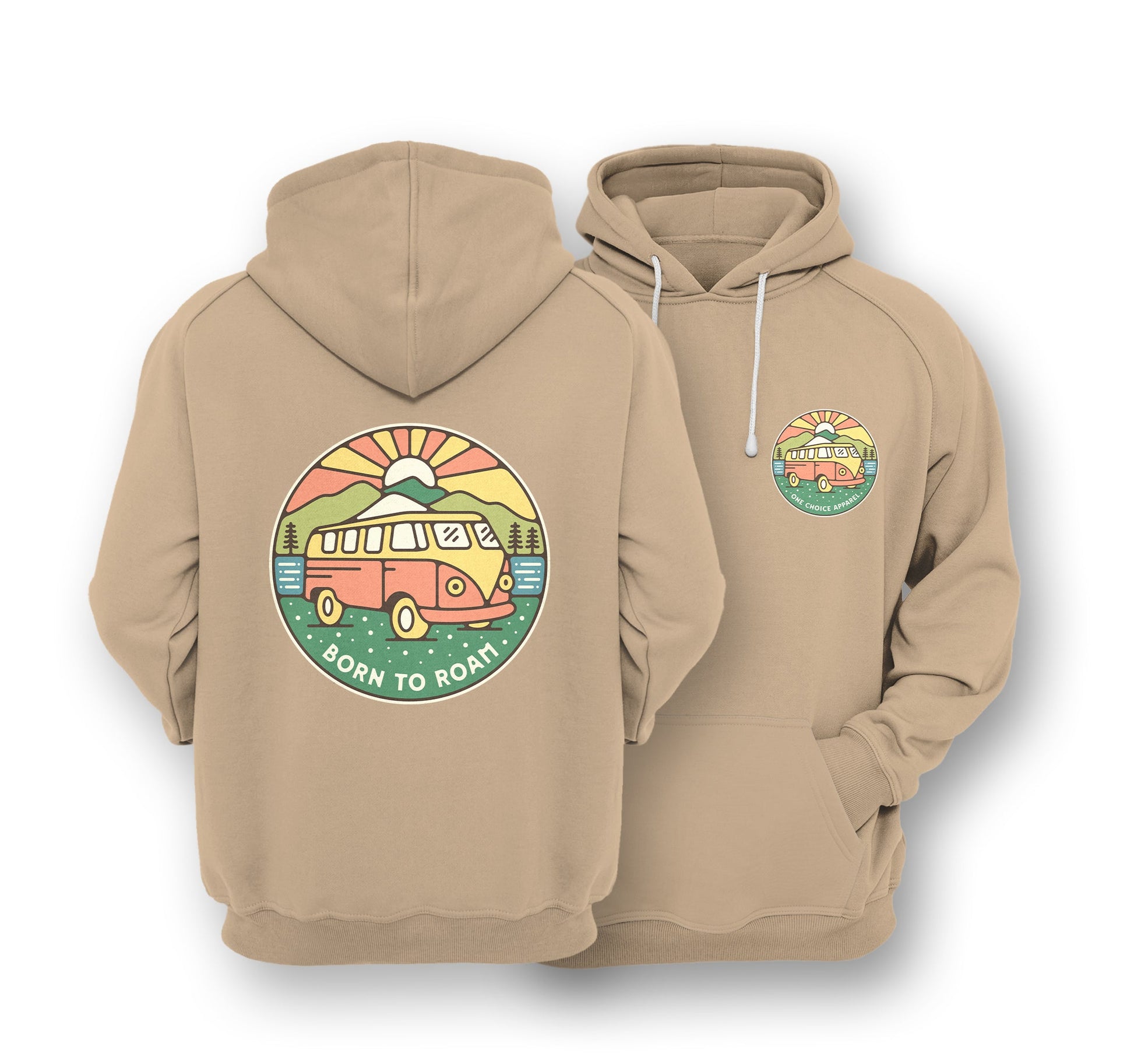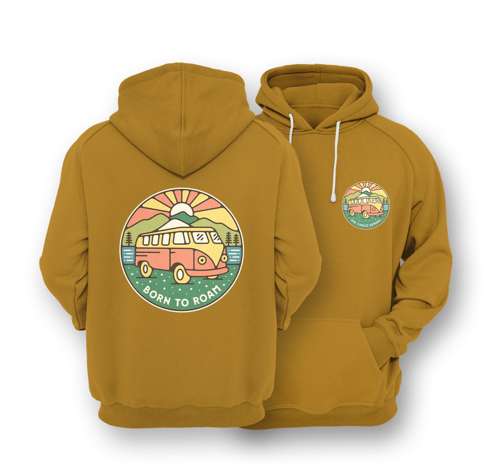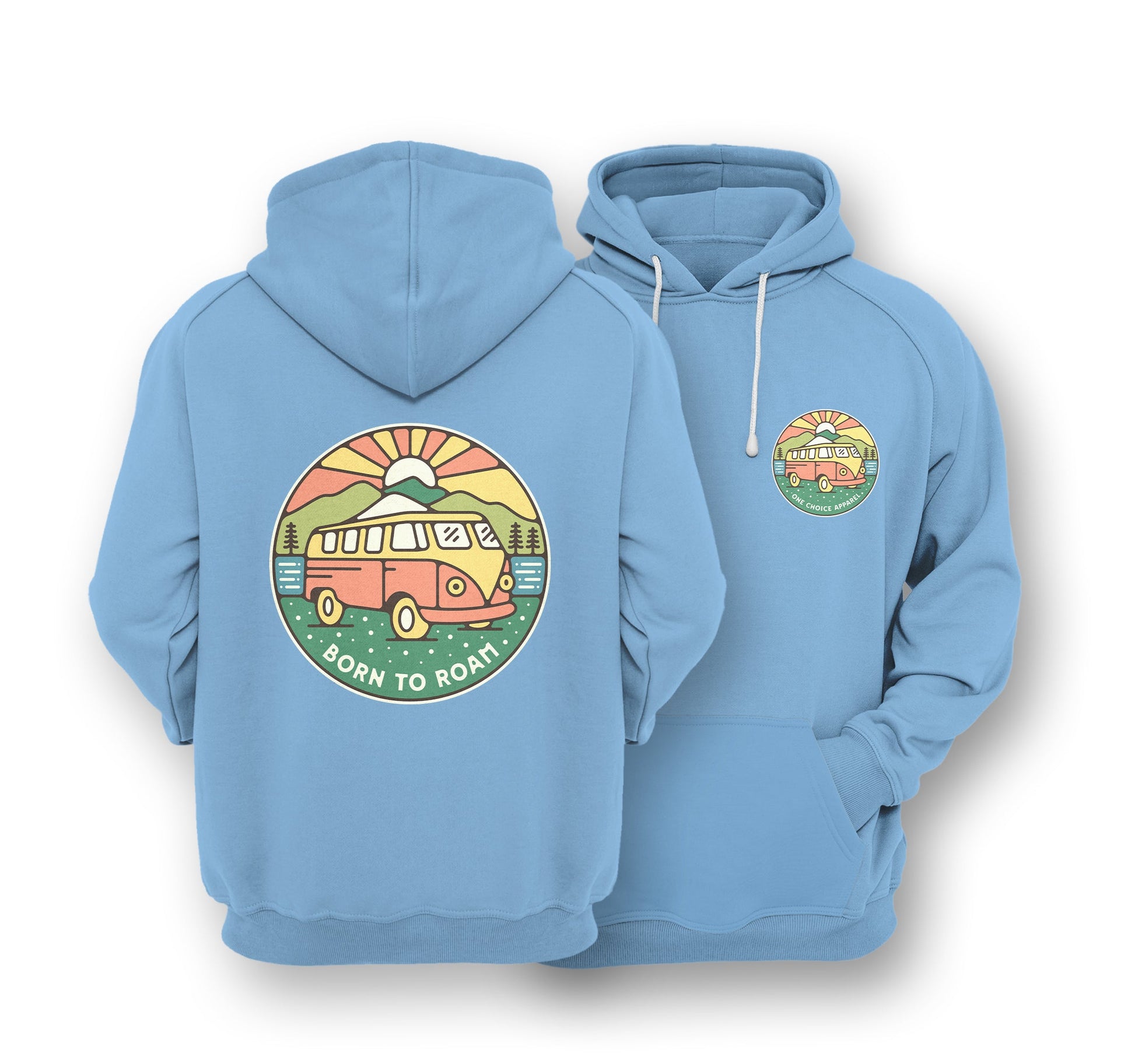 - Sustainable Hoodie - Born To Roam; Beautiful design printed on the back with pocket print on the front