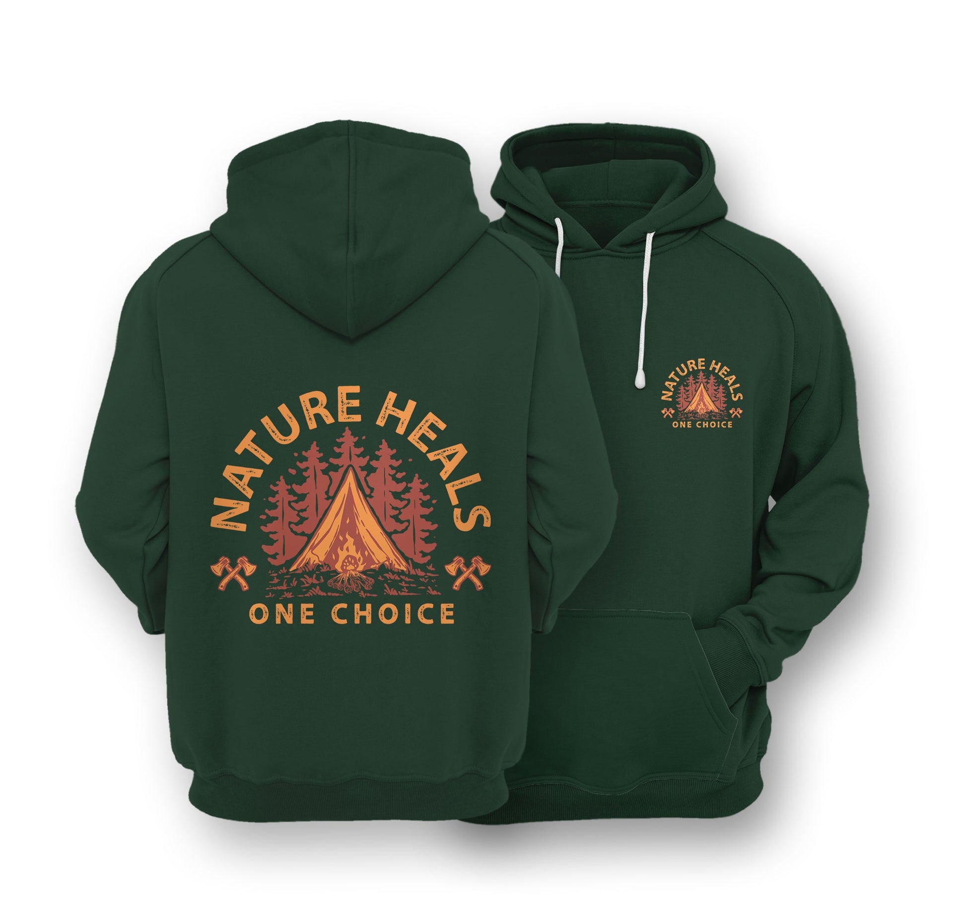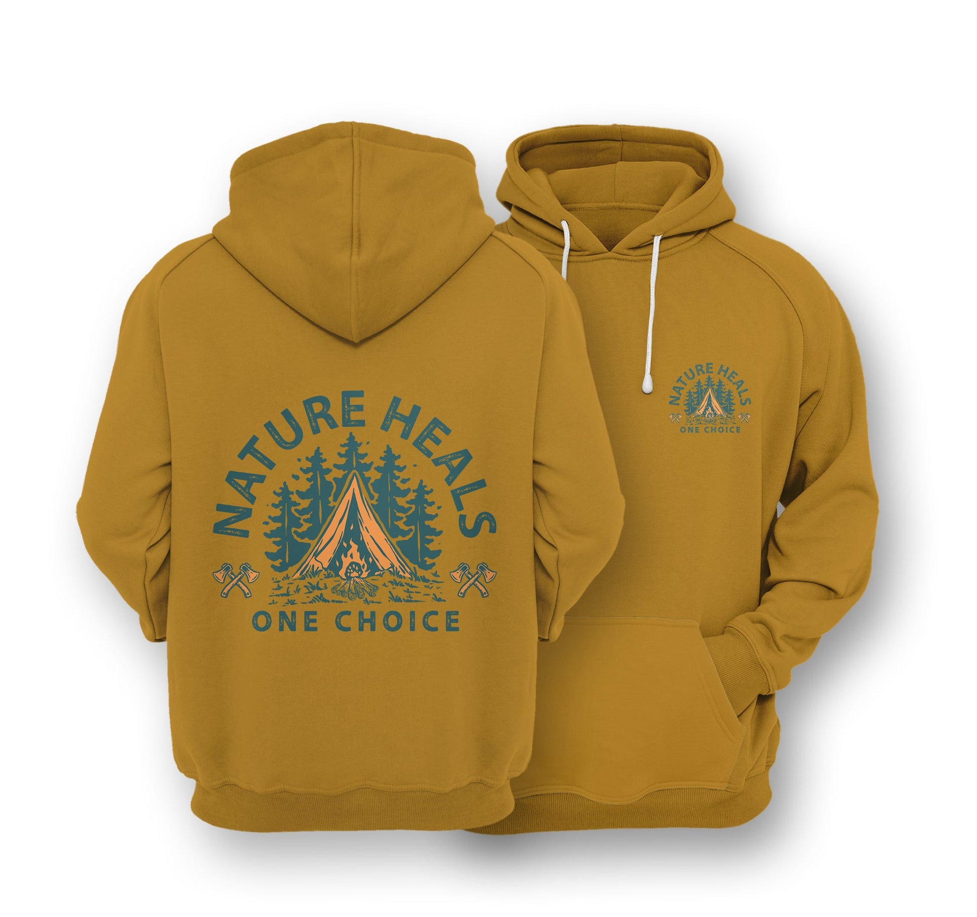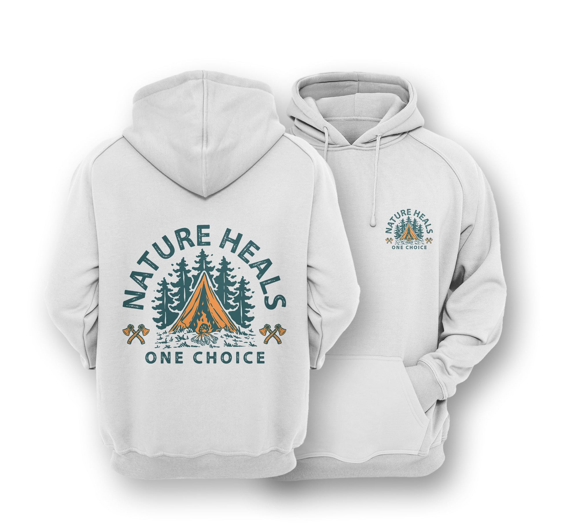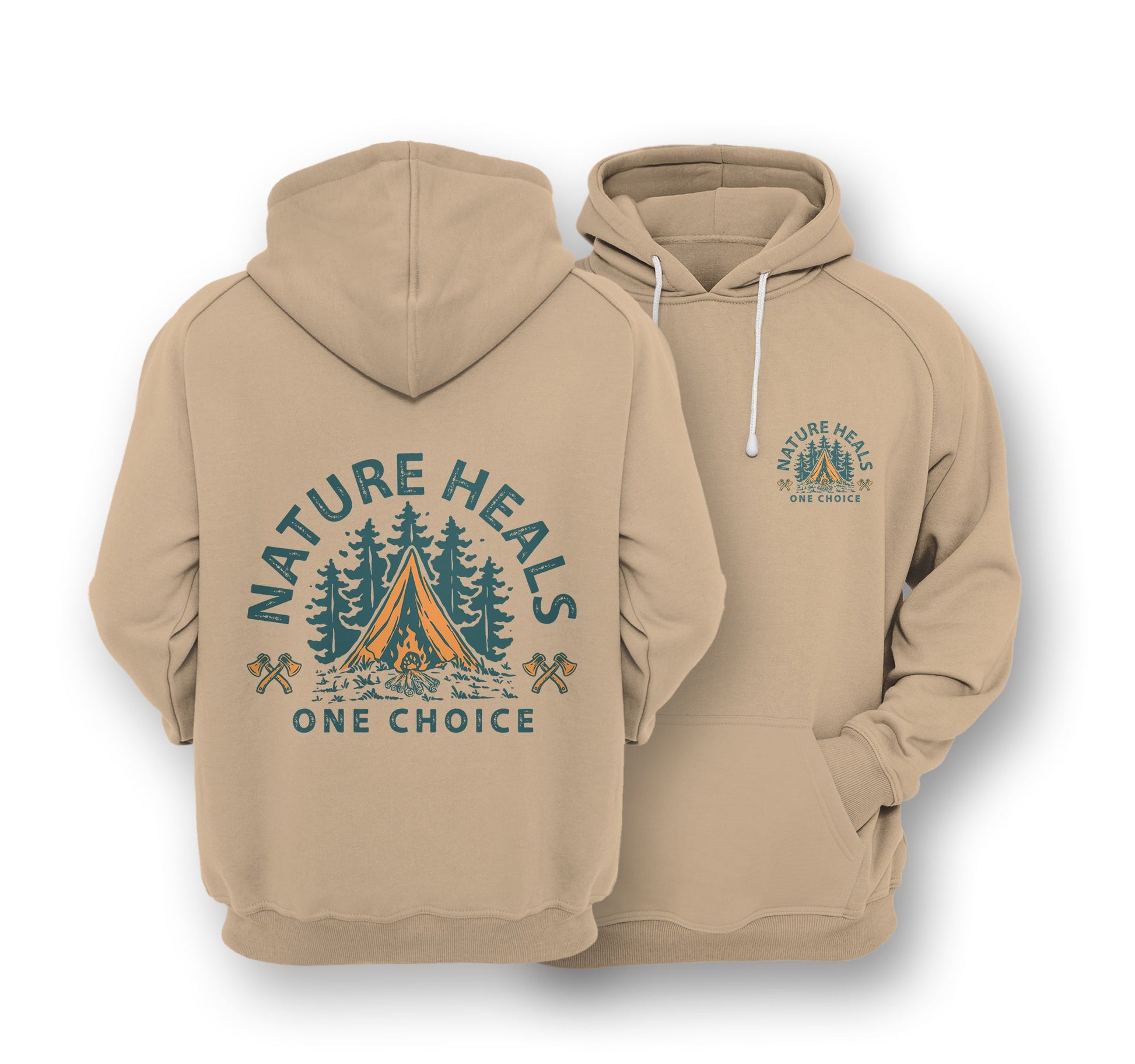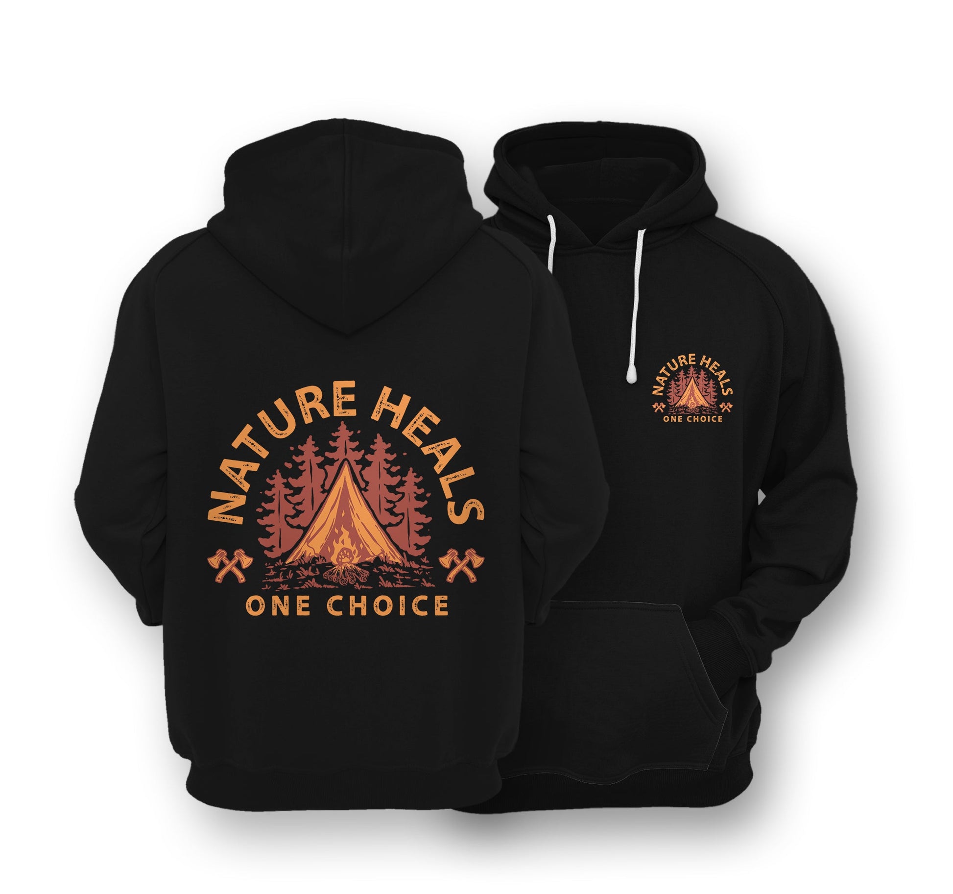 - Nature Heals Hoodie; Beautiful design printed on the back with pocket print on the front